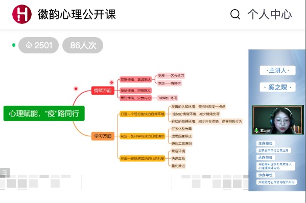 2022年10月20日,由高新區(qū)社會(huì)事業(yè)局、高新區(qū)校外未成年人心理健康輔導(dǎo)站主辦,安徽徽韻心理咨詢有限公司承辦的“心理賦能,“疫”路同行——疫情當(dāng)下,我們?nèi)绾魏煤谜疹欁约?span style="color: rgb(51, 51, 51); background: rgb(255, 255, 255); font-size: 14px; font-family: 宋體;">”直播講座走進(jìn)合肥高新創(chuàng)新實(shí)驗(yàn)中學(xué)。本次活動(dòng)邀請(qǐng)了中學(xué)心理健康專職教師、合肥市包河區(qū)“教學(xué)新秀”奚之琛老師主講,與合肥高新創(chuàng)新實(shí)驗(yàn)中學(xué)的孩子們一起聊一聊在當(dāng)下不確定的疫情中,如何做確定的自己。
